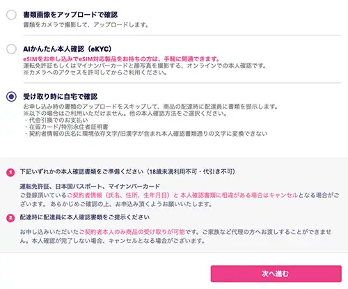 1回線は『eSIM』を選択しているので、2回線目は物理的な『SIMカード』をセレクト(eSIMが使えない端末もあるので)。本人確認は『受け取り時に自宅で確認』を選びました。
