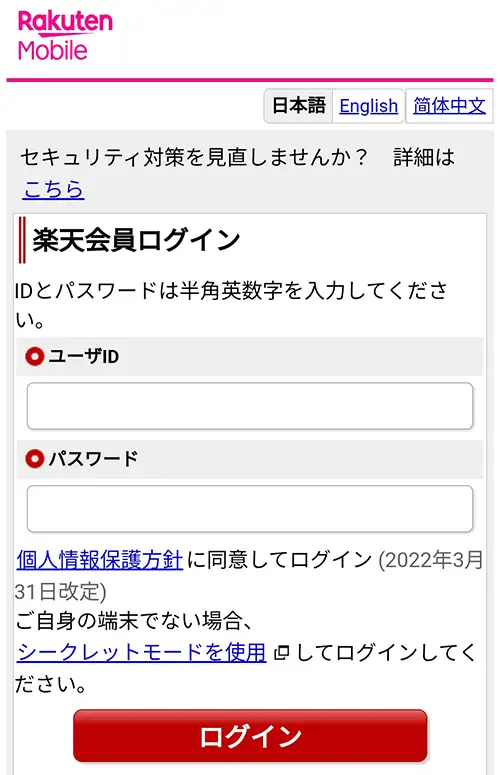 3.楽天モバイルの申し込み時に利用したユーザIDとパスワードを入力してログイン