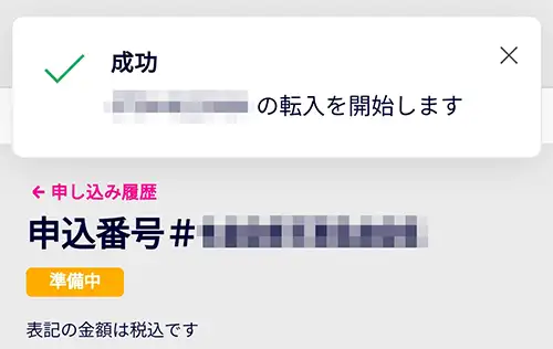 9.『成功!』と表示されたら、転入手続きが完了するまで約10〜30分待機(午前9時〜午後9時の間に転入手続き開始の場合。Wi-Fi接続状態ではステータスの変更を確認出来る)。