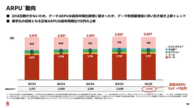 楽天モバイルが2025年5月14日に公表した『決算説明会プレゼンテーション資料(2025年第1四半期)』を参考にすると、2025年第1四半期で黒字化の目安となる正味ARPUが『2,430円』に。