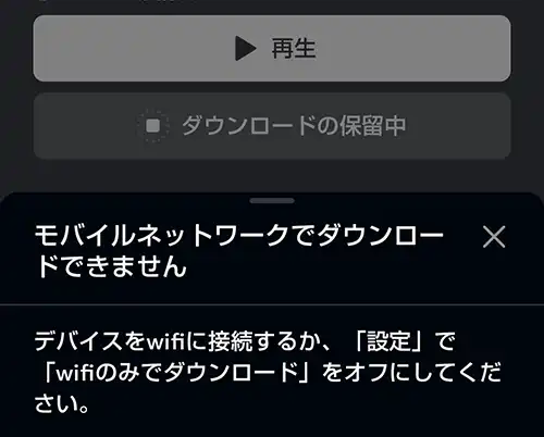 同機能をONにした状態でコンテンツをダウンロードしようとすると、『モバイルネットワークでダウンロードできません』と表示されて『一時停止』の状態に。
