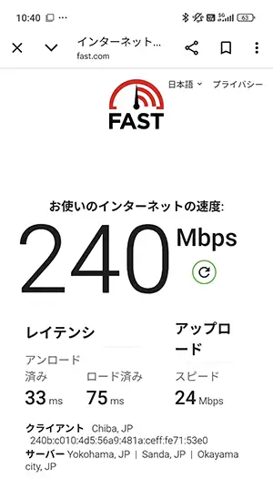 2番目に下りがはやかったのは五反田駅で『240Mbps』。こちらも『5G』が途切れることはなく、人の往来が多い山手線の駅とは思えない驚きの速度。