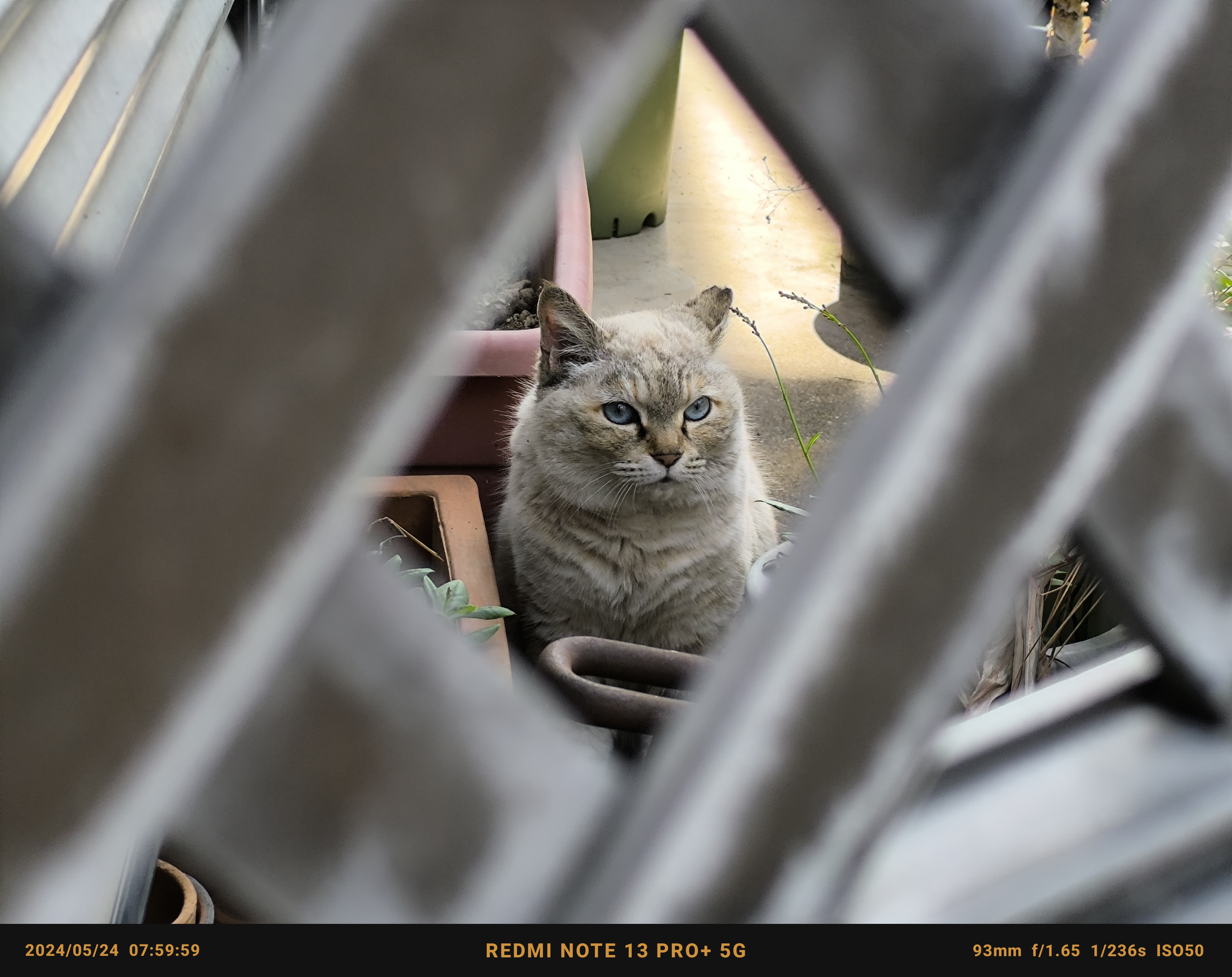 一般的な望遠レンズは焦点距離が長くなり、それに伴い光量が減少します(F値が大きくなる)。Redmi Note 13 Pro+ 5Gは『4倍ロスレスズーム』時も『F1.65』の大口径レンズを使用。1画素が暗くなりやすいインセンサーズームの弱点を、レンズの集光量で補っているなという印象(勿論オールマイティではない)。