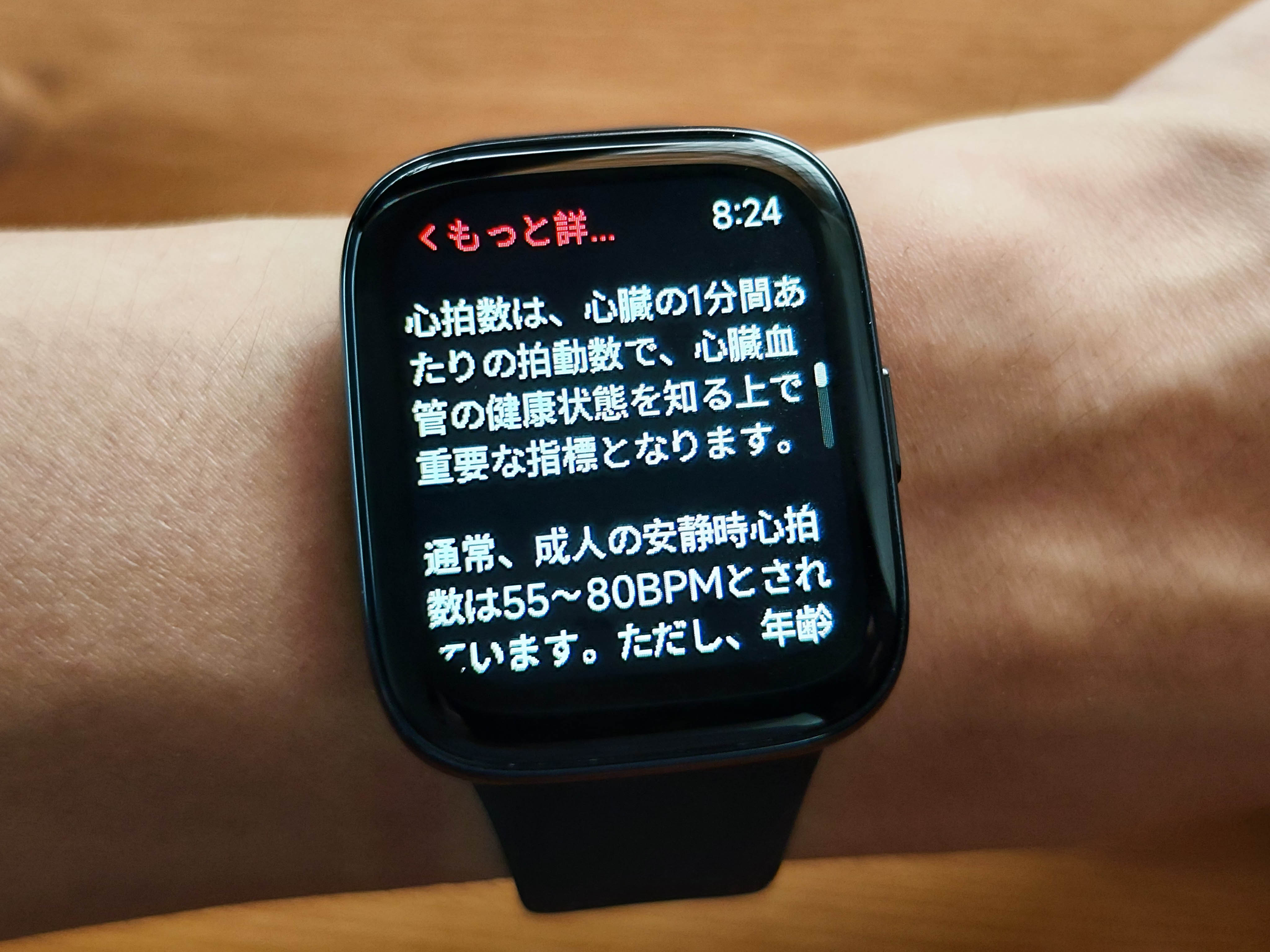 購入前から分かっていたことですが、Redmi Watch 3 Activeのディスプレイ解像度は『240 × 280』とやや低め。例えるなら『ファミコンゲームの文字表示』を少し綺麗にした感じ(英数字はあまり粗さを感じない)。