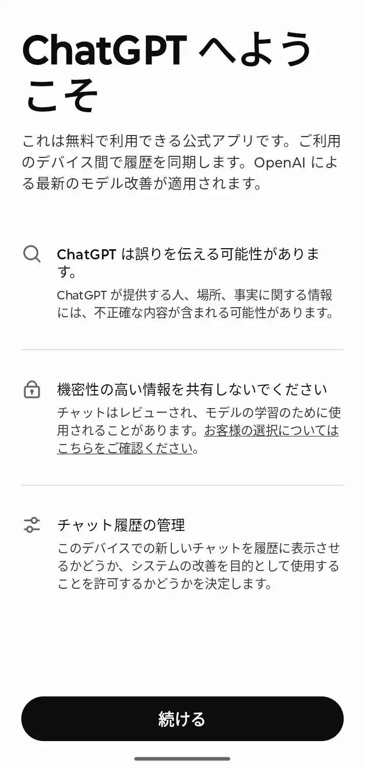 Chat GPTアプリを開くと、『無料で使える』『不正確な情報を提供する可能性がある』『機密情報は共有しないで』といった内容が書かれた画面が表示されます(英語で表示される場合あり。内容は同じ)。