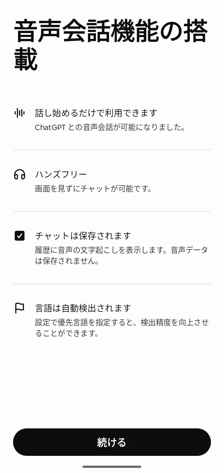 メッセージ入力ウィンドウ右側の『ヘッドフォンアイコン(マイクではない)』を選択すると、『音声会話』に関する詳細が表示。内容を読んで『続ける』。