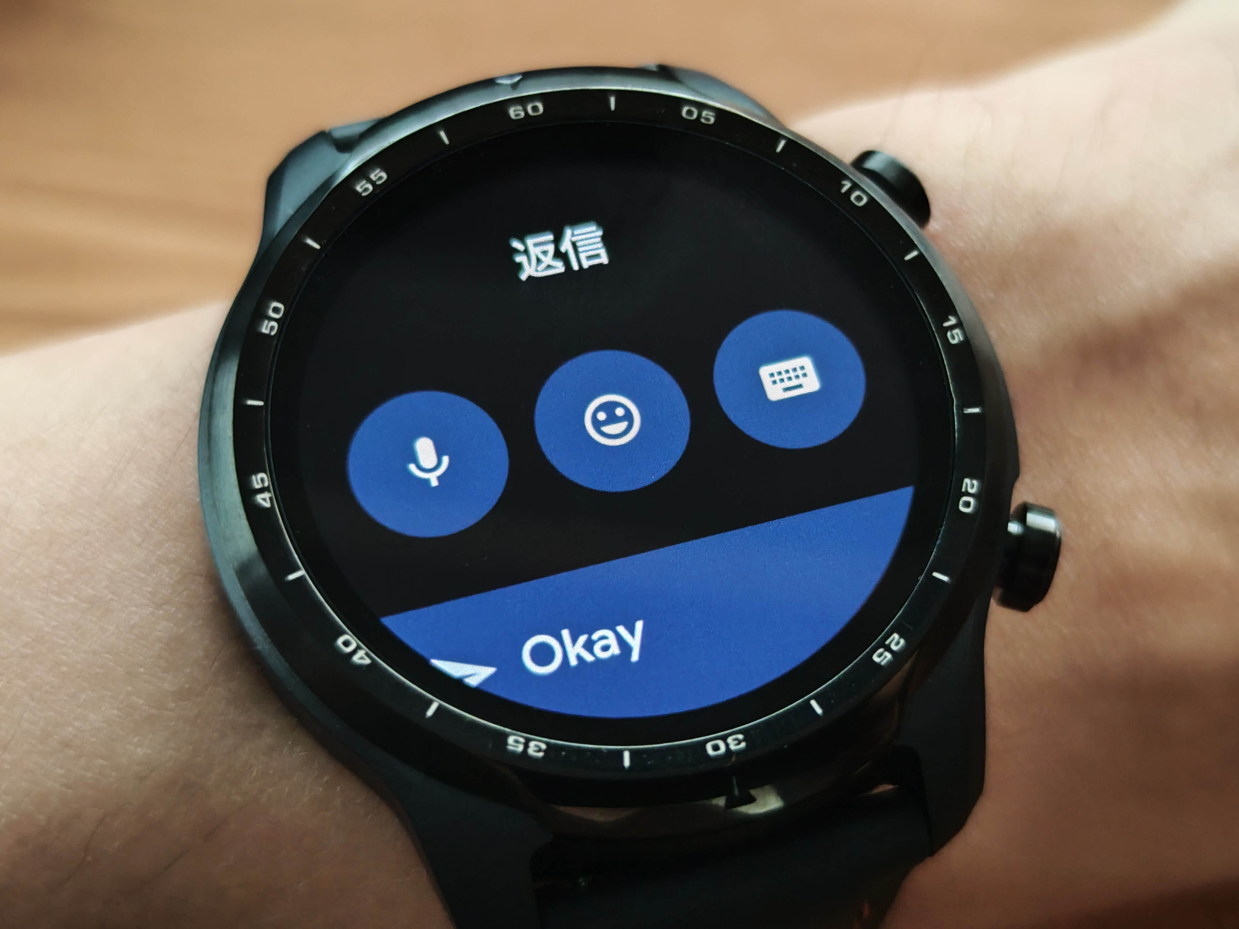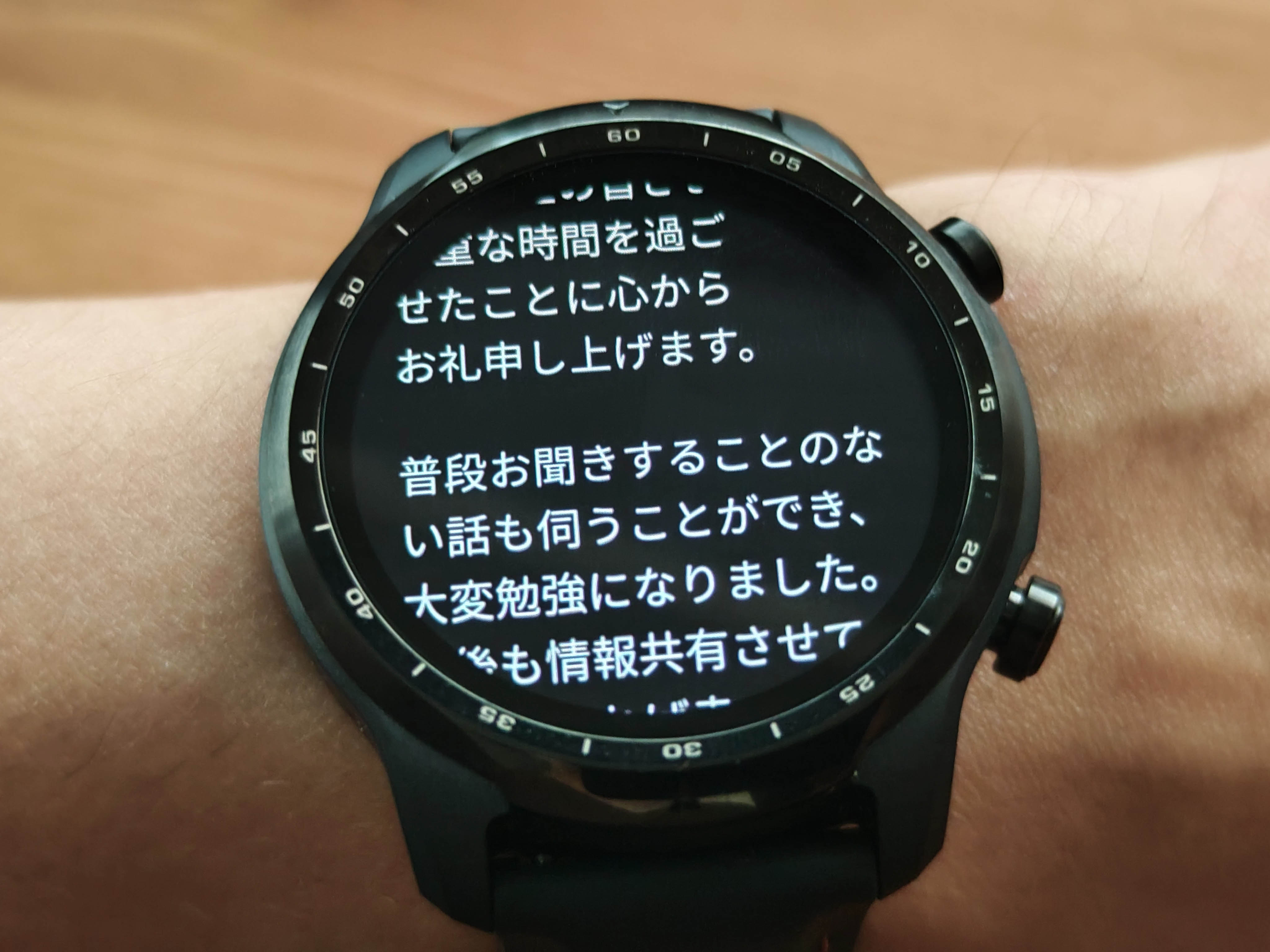 大型ディスプレイを活かして、100文字を超える文章も無理なく読めます(LINEは通知画面で250文字程度まで受信)。返信は『打ち込み(Gboad)』もしくは『Google音声入力』。スマートウォッチ(TicWatch Pro 3 GPS)から直接行えます。