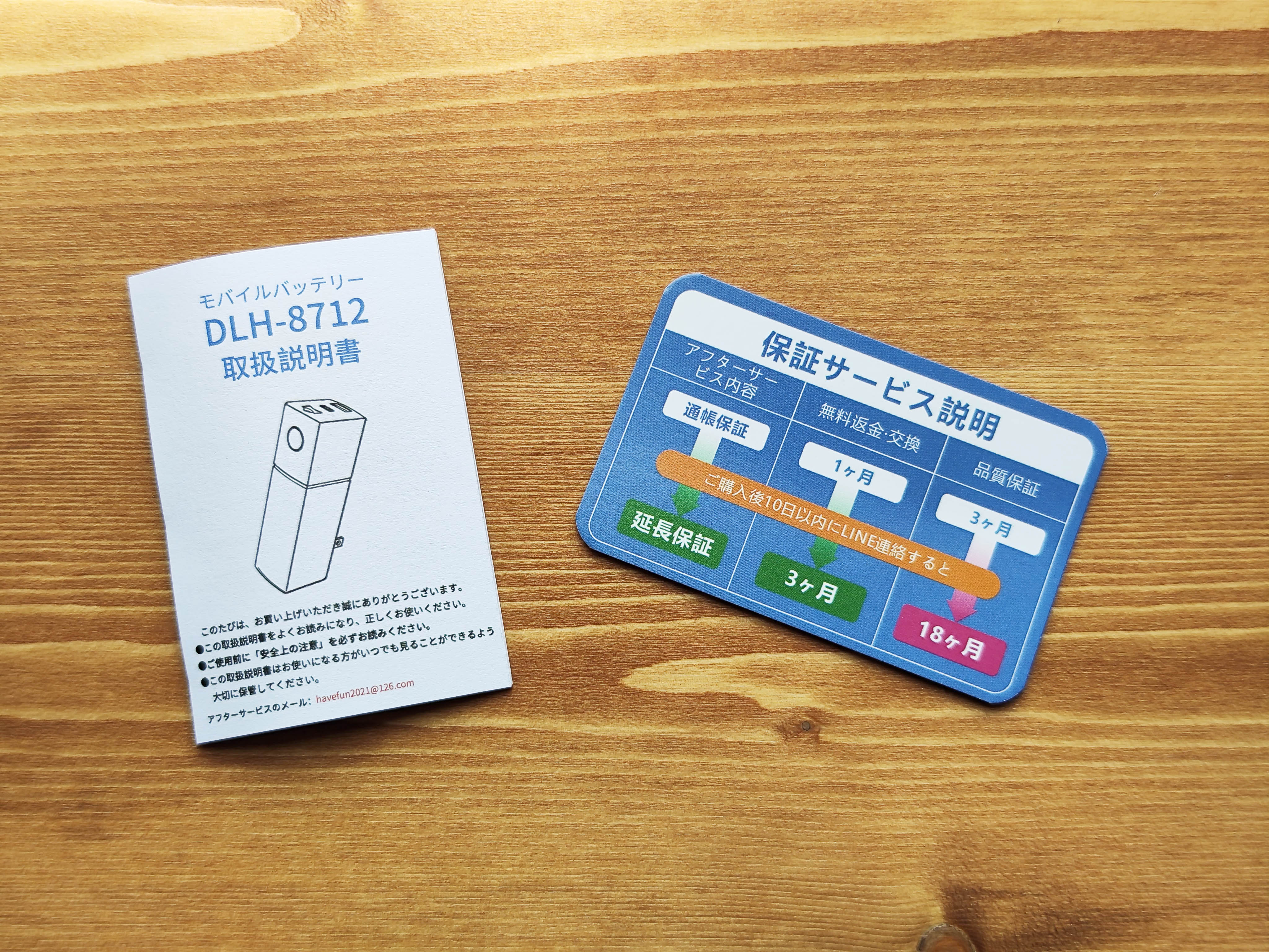 同梱品は『充電器本体』『ストラップ』『取扱説明書』『保証サービス説明(購入後LINEに連絡すると返金期間が1ヶ月→3ヶ月、品質保証が3ヶ月→18ヶ月に延長されるというもの)』。