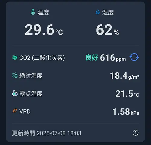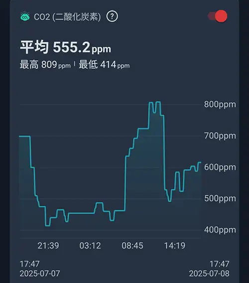 二酸化炭素濃度を確認すると、午前8時過ぎから急激に上がっています。これは窓を閉めてクーラーをつけはじめた時間帯と一致(換気扇は弱)。