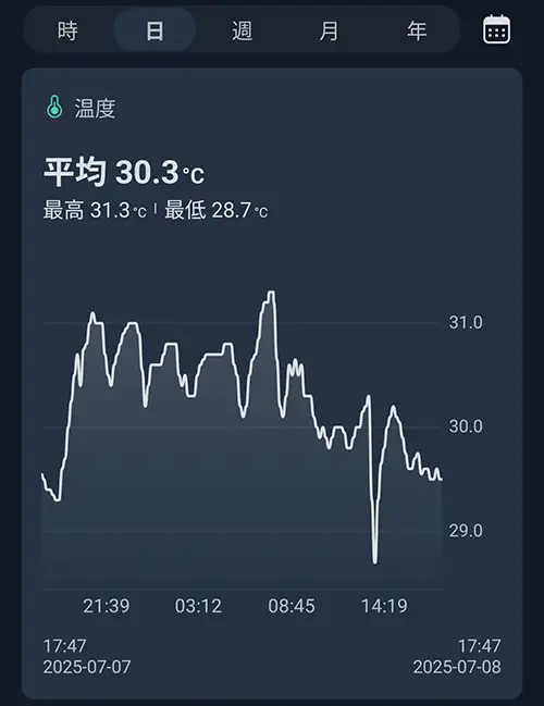 『温度』『湿度』『二酸化炭素』『絶対湿度』『露点温度』『VPD』は、それぞれ『時』『日』『週』『月』『年』でグラフ表示出来ます。日付を指定することも。