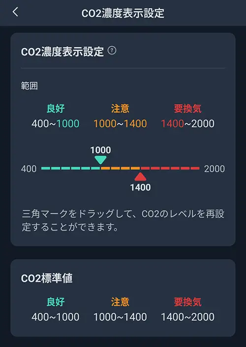 『CO2濃度表示設定』では、ディスプレイに表示されている『緑(良好)』『黄色(注意)』『赤(要換気)』のゾーンを手動で変更出来ます。デフォルトでは『400〜1,000ppm』が良好。『1,000〜1,400ppm』が注意。『1,400〜2,000ppm』は要換気。