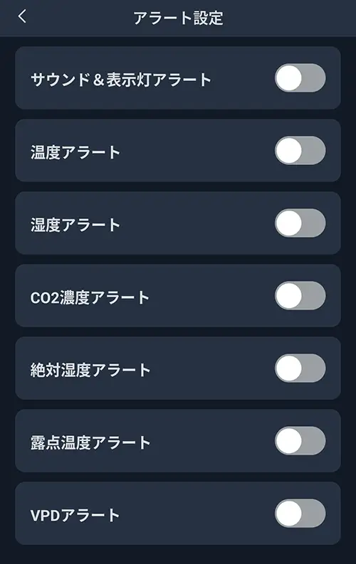 『アラート設定』からは、『サウンド&表示アラート』『温度アラート』『湿度アラート』『CO2アラート』『絶対湿度アラート』『露点温度アラート』『VPDアラート』の設定が可能。