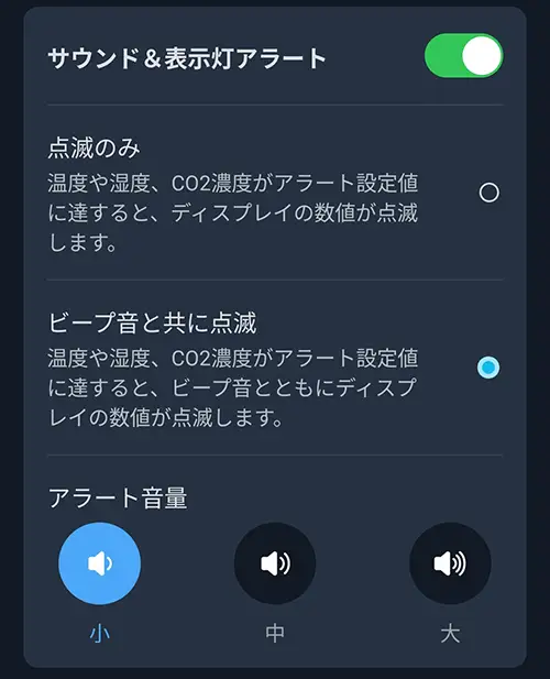 - 指定の温度・二酸化炭素濃度で『サウンド&表示灯アラート』が起動するように設定