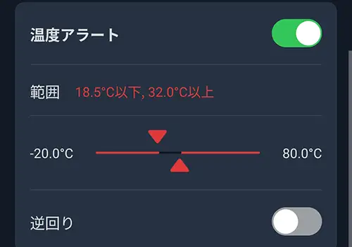 続けて『温度アラート』をONに。室温が『15度を下回る』『32度を超える』と『ビープ音と共に点滅』が発動します。『逆回り』をONにすると、15度〜32度の範囲でアラートが機能。