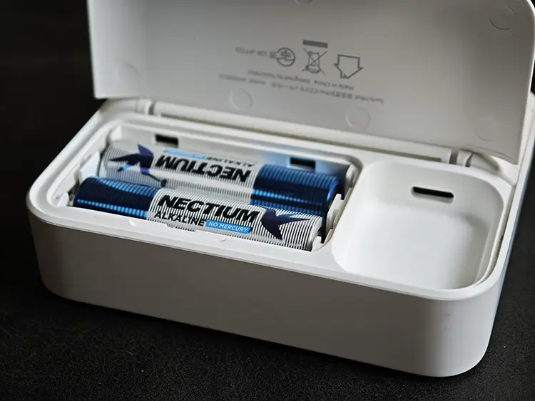 電源は単3電池(絶縁シートを外すとONになる)か電源アダプター(USB-C、5V/1A)。単3電池の場合、30分に一度二酸化炭素濃度を検知するように設定して約1年駆動するようです(公式より)。