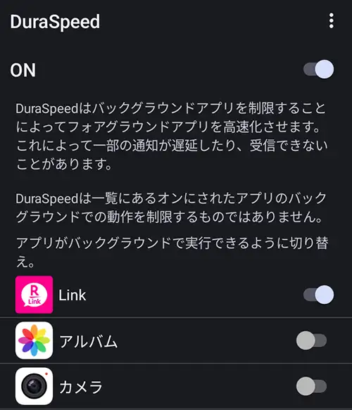 iPlay 70 mini Proで利用可能なDuraSpeedはONにするとバックグラウンドのアプリを制限。同機能をONにしつつ特定のアプリを動作させる場合は個別にチェックを入れる必要がある。