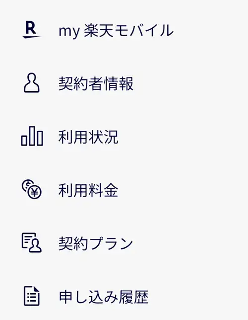 my楽天モバイルにログインし、右上の横3本線アイコン内から『契約プラン』を選択。