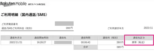 標準通話アプリで転送された分は利用明細に『携帯(転送)』と記載される(楽天モバイルより)