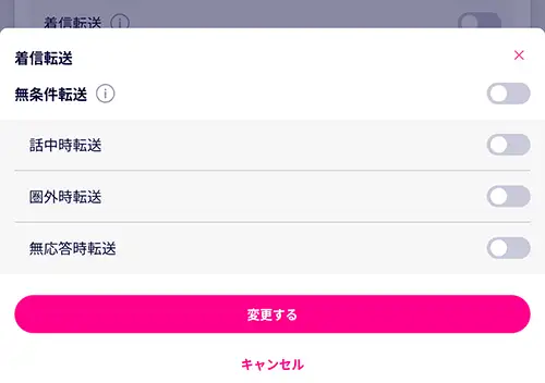 転送パターンは『無条件転送』『話中転送』『圏外時転送』『無応答時転送』から選択します。