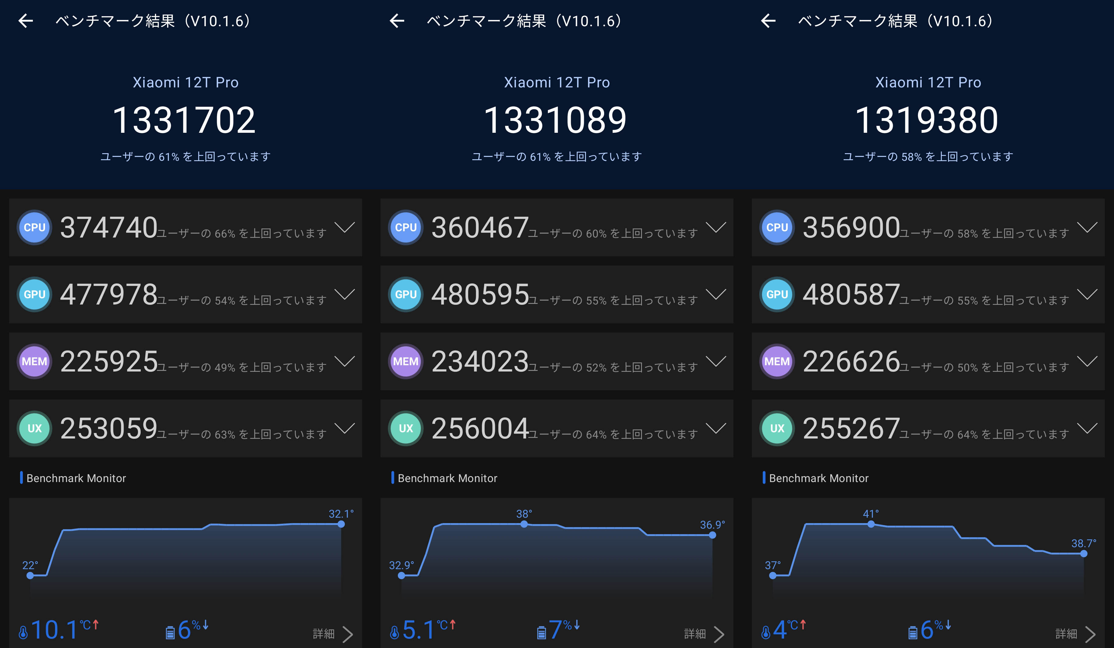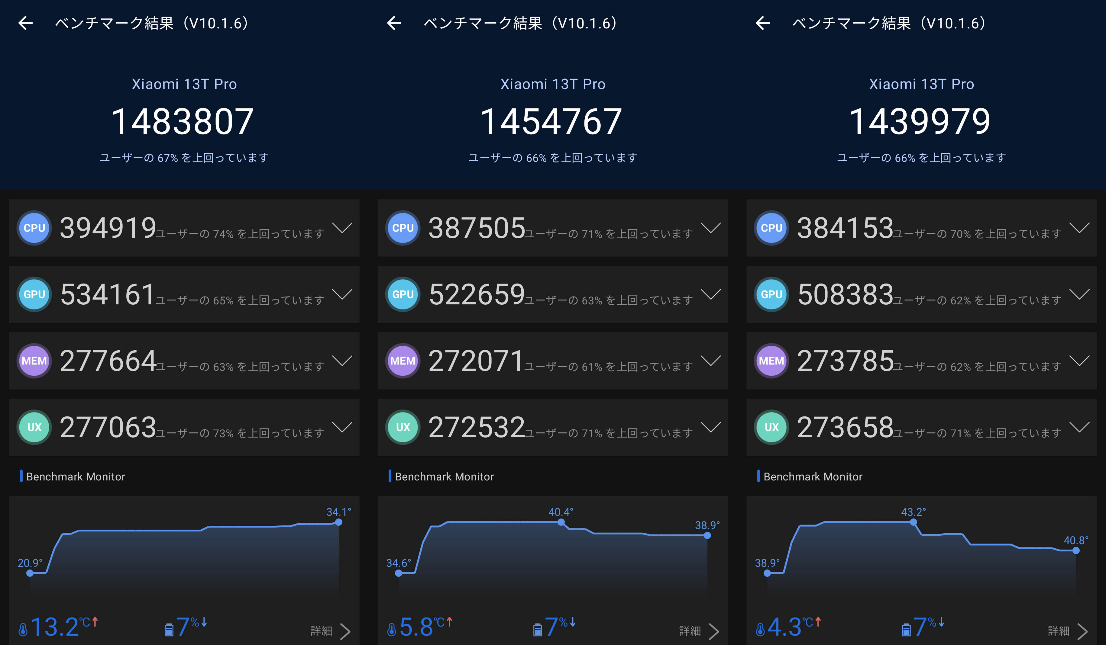 Xiaomi 13T Proは3回連続で『140万』の大台を突破。3回目においても電池の温度上昇を最高『43.2度』にとどめています。一般的なリチウムイオン電池は『45度』を超えると劣化しやすくなるとされているので、その範囲内で高いパフォーマンスを維持したということです。