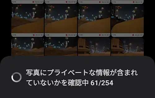 Xiaomiのファイルマネージャーからアップロードしようとすると、『写真にプライベートな情報が含まれていないか確認中』と表示され、その確認作業にそれなりの時間を要しました。