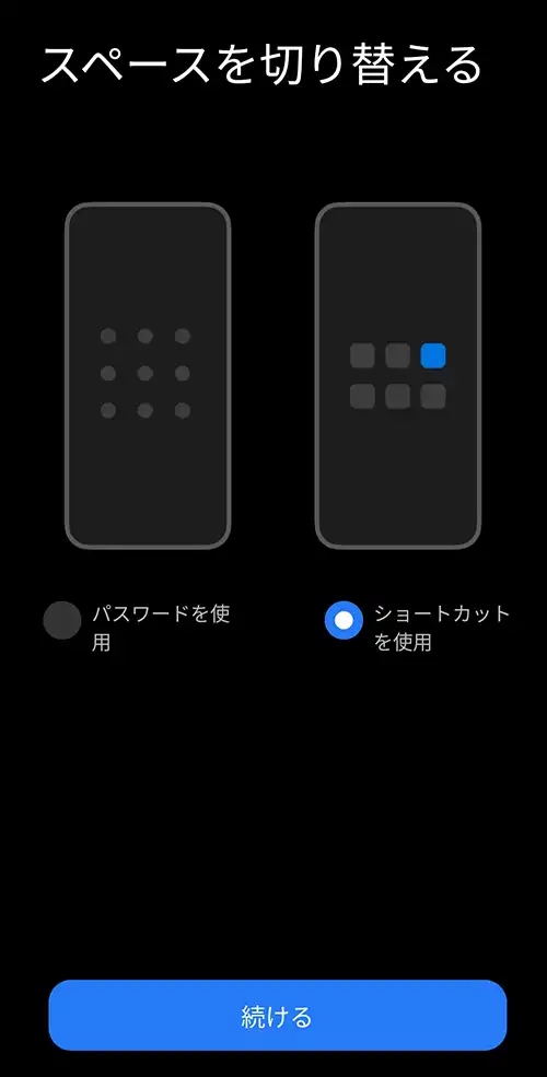 4.スペースを切り替える方法を『パスワードを使用』『ショートカットを使用』から選択(今回はショートカットを使用)