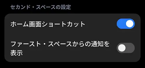 『ホーム画面ショートカット』をONにすると、セカンドスペースにファーストスペースへのショートカットアイコン(切り替える)が表示されます。