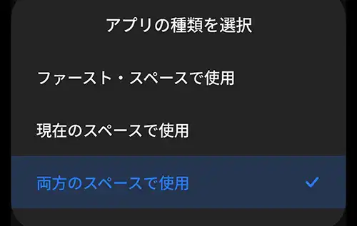 この機能は中々優秀です。例えば『楽天ペイ』をどちらのスペースでも使用したい場合は『両方のスペースで使用』を設定。