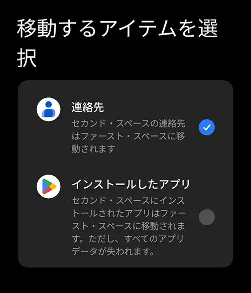 セカンド・スペースの削除はこちらから行います。セカンド・スペースで保存したデータは『ファースト・スペースに移動する』『削除する』から選ぶことが可能です(削除する場合はインストールしたアプリにチェックを入れる)。