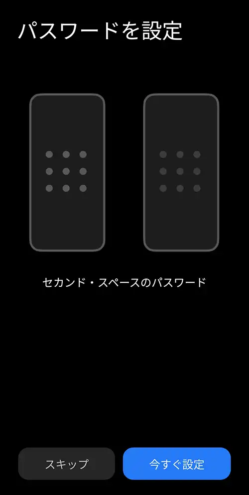 5.セカンドスペースに移動する際にパスワードを設定する場合は『今すぐ設定』を選択(今回はスキップを選択)