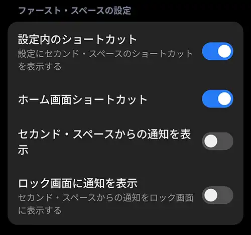 『ファースト・スペースからの通知を表示』は『スマホ疲れ解消』『プライベートと仕事で分ける』などが目的であれば『OFF』の方が良いかと。
