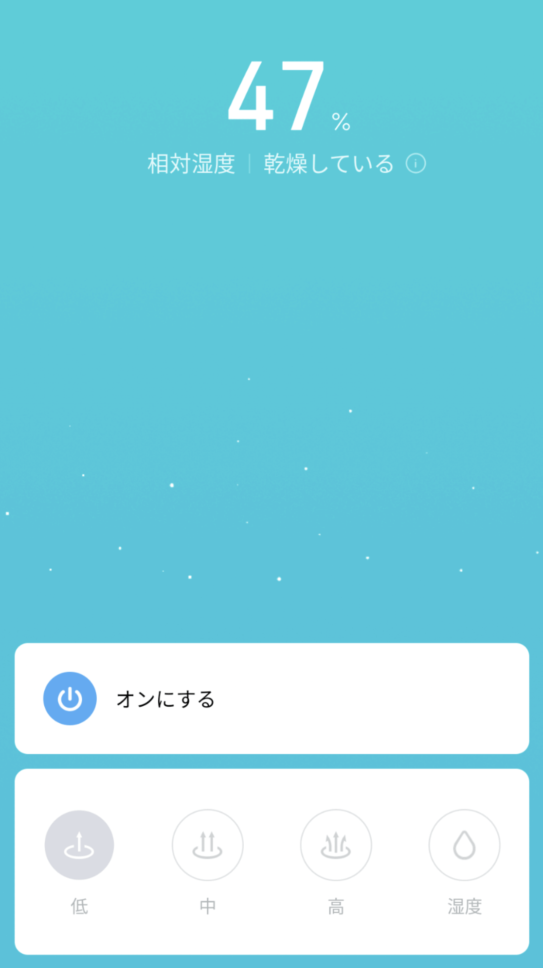 正面下部には『低速』『中速』『高速』『湿度(40~70%の湿度を維持。湿度の設定はスマートフォンアプリMi Homeで可能)』に切り替え可能な『モードボタン』と『電源ON/OFFボタン』が縦に並んでいます。高速設定に切り替えると目に見えて蒸気の量がアップ。広い部屋での利用にも適していると言えるでしょう。しっかり除菌されているので顔に直接当てても違和感なく心地良い。この時点で良い買い物だと実感しました。